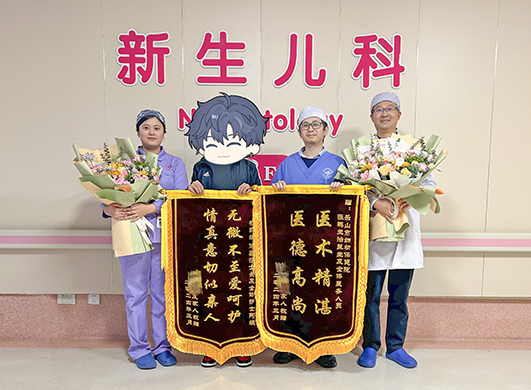 說到第三面錦旗,那是今年3月,市民陽女士在市婦幼保健院分娩一男嬰,由于宮內(nèi)發(fā)育遲緩,寶寶體重僅有2.1千克。嬰兒出生后,呼吸稍促,血氧飽和度降低,隨即便被轉(zhuǎn)至新生兒科,給予呼吸支持、營養(yǎng)支持等治療。