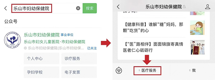 一、微信搜索“樂山市婦幼保健院”公眾號,點擊“醫(yī)療服務”。