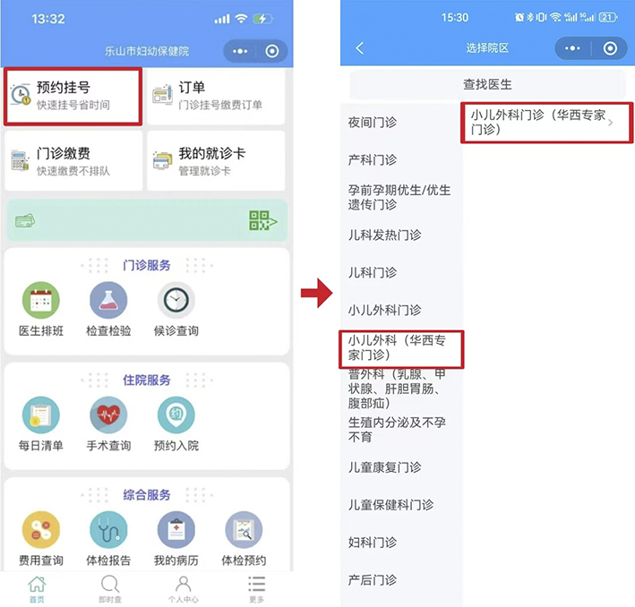 三、點擊“預約掛號”,選擇小兒外科(華西專家門診)完成預約。