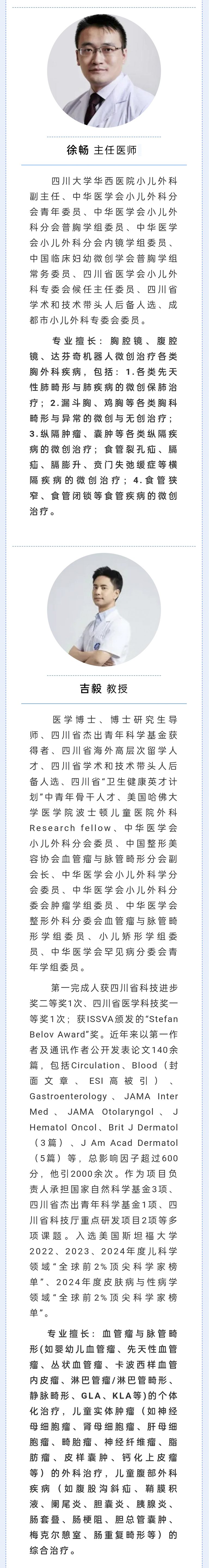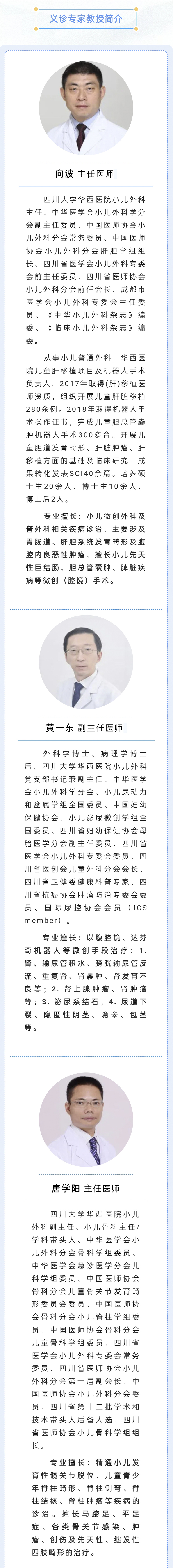 從1月12日起,華西小兒外科的專家們將每周輪流蒞臨我院坐診,為孩子們帶來專業(yè)、權(quán)威的診療服務。專業(yè)涵蓋新生兒外科、小兒普通外科、小兒泌尿外科、小兒骨科、小兒胸外科、小兒腫瘤外科等。
