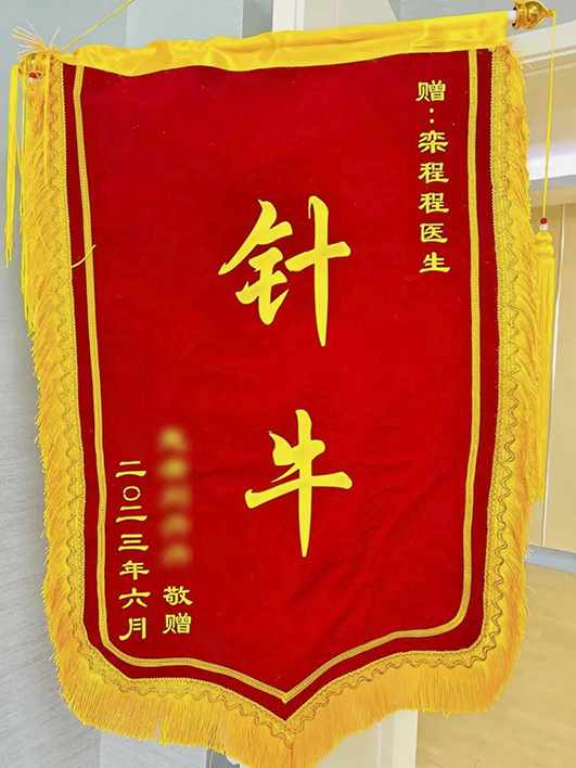 “我不知道如何表示感謝,千言萬語匯成兩個字‘針牛’!”——日前,我院中醫(yī)科負責人、執(zhí)業(yè)中醫(yī)師欒程程收到患者送來的一面別具特色的錦旗,錦旗上印著的“針?!倍质中涯俊_@究竟是怎么回事?“針牛”背后又有著怎樣的故事呢?